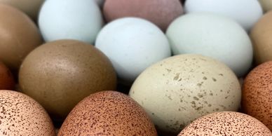 Rainbow Dozens may contain any arrangement of my colorful laying breeds. I'll add the most beautiful eggs available each week! Possible varieties in your dozen may include: BBS Copper Marans, Several Types of Olive Eggers, Welsummers and Legbars. The assortment will change a bit week to week.